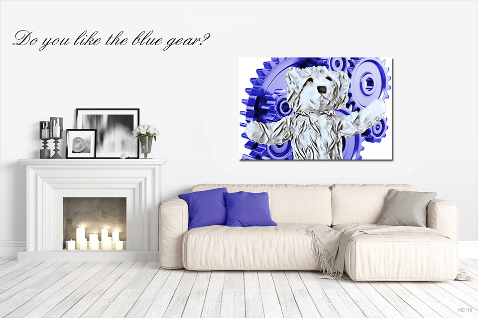 "Mumbly 005 - Do you like the blue gear?" is a digital creation printed on to a stretched canvas. Signed by the artist on the back.